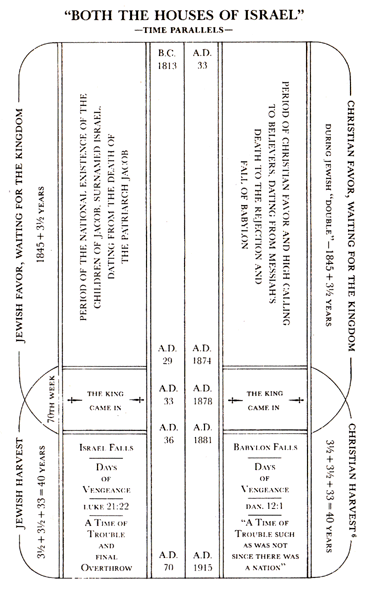 The wonderful parallelism of the Jewish and Gospel dispensations taught us the same truth with additional features. The second advent of our Lord in the end or harvest of the Gospel age, occurring in the fall of 1874, proves to be at a point of time exactly parallel to the time of his first advent, in the end of the Jewish age. (See Table of Correspondencies, Vol. II, pages 246 and 247.) As every prominent feature of the Gospel dispensation is marked by a corresponding parallel in that typical dispensation, so we find that this most noteworthy event taught by the jubilee has its corresponding parallel. Our Lord's presence as [C126] Bridegroom, Reaper and King is shown in both dispensations. Even the movement on the part of the virgins going forth to meet him, their disappointment and the tarrying time of thirty years find their parallel both in time and circumstances. And the parallelism continues to the full end of the harvest of this dispensationuntil the overthrow of the professedly Christian kingdoms, really "kingdoms of this world," and the full establishment of the Kingdom of God in the earth after 1914, the terminus of the Times of the Gentiles. (See Vol. II, chapter iv.) This coming trouble and overthrow, we have seen, had its parallel in the destruction of Jerusalem and the complete overthrow of the Jewish polity, A.D. 70another parallel, corresponding in both time and circumstances.