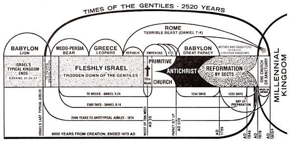 The focus of time prophecy upon the harvest and matters connected with the Lord's presence and the establishment of the Kingdom, will be impressed upon the mind by a careful study of the accompanying diagrams, one of which shows the parallels or correspondencies between the Gospel age and its type, the Jewish age, and how the various prominent features in this harvest are marked by the great prophecies, while the other concisely shows the history of the world as related to that of God's typical and real churches (Jewish and Gospel), and points out the prophetic measures relating to them.